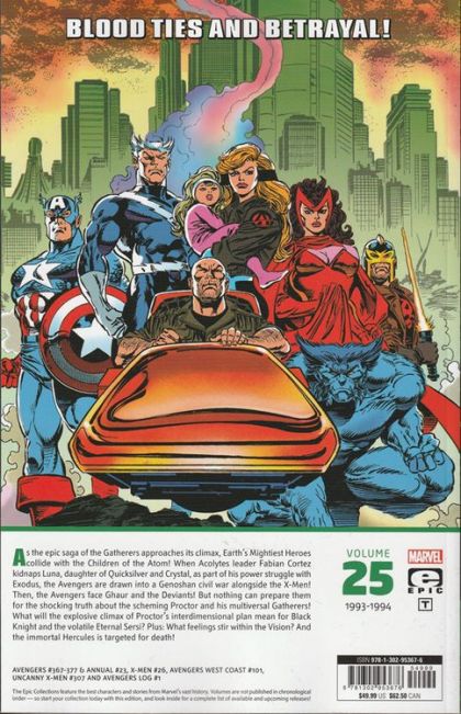 Blood ties and betrayal! As the epic saga of the Gatherers approaches its climax, Earth's Mightiest Heroes collide with the Children of the Atom! When Acolytes leader Fabian Cortez kidnaps Luna, daughter of Quicksilver and Crystal, as part of his power struggle with Exodus, the Avengers are drawn into a Genoshan civil war alongside the X-Men! Then, the Avengers face Ghaur and the Deviants! But nothing can prepare them for the shocking truth about the scheming Proctor and his multiversal Gatherers! What will the explosive climax of Proctor's interdimensional plan mean for Black Knight and the volatile Eternal Sersi? Plus: What feelings stir within the Vision? And the immortal Hercules is targeted for death! Collecting AVENGERS (1963) #367-377 and ANNUAL #23, X-MEN (1991) #26, AVENGERS WEST COAST #101, UNCANNY X-MEN (1981) #307, and AVENGERS LOG #1. Rated T
