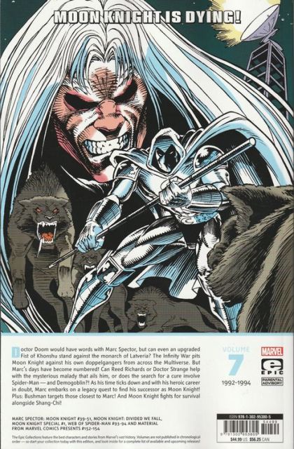 Moon Knight's adventures in the 90s get the epic collection treatment! Moon Knight is dying! Doctor Doom would have words with Marc Spector - but can even an upgraded Fist of Khonshu stand against the monarch of Latveria? The Infinity War pits Moon Knight against his own doppelgangers from across the multiverse. But Marc's days are numbered, and neither Reed Richards nor Doctor Strange can help with the mysterious malady that ails him. Does the search for a cure involve Spider-Man - and Demogoblin?! As his time ticks down and with his heroic career in doubt, Marc embarks on a legacy quest to find his successor as Moon Knight! Plus: Bushman targets those closest to Marc! And Moon Knight fights for survival alongside Shang-Chi! COLLECTING: Marc Spector: Moon Knight (1989) 39-51, Moon Knight: Divided We Fall (1992) 1, Moon Knight Special (1992) 1, Web of Spider-Man (1985) 93-94, material from Marvel Comics Presents (1988) 152-154 Rated T+