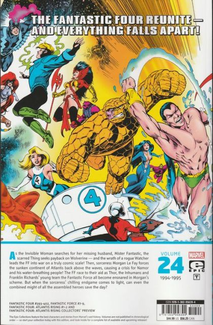 A seismic crossover that literally reshaped the face of Marvel's Earth! The Fantastic Four reunite...and everything falls apart! As the Invisible Woman searches for her missing husband Mr. Fantastic, the scarred Thing seeks payback on Wolverine, and the wrath of a rogue Watcher leads the FF into war on a truly cosmic scale! Then, sorceress Morgan Le Fay forces the sunken continent of Atlantis back above the waves, causing a crisis for Namor and his water-breathing people! The FF race to their aid as Thor, the Inhumans and Franklin Richards' young team the Fantastic Force all become ensnared in Morgan's scheme. But when the sorceress' chilling endgame comes to light, can even the heroes' combined might save the day? COLLECTING: Fantastic Four (1961) 393-402, Fantastic Force (1994) 7-9, Fantastic Four: Atlantis Rising (1995) 1-2, Fantastic Four: Atlantis Rising Collector's Preview (1995) 1 Rated T