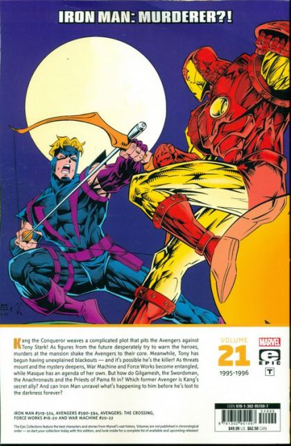 Iron Man: murderer?! Kang the Conqueror weaves a complicated plot that pits the Avengers against Tony Stark! As figures from the future desperately try to warn the heroes, murders at the mansion shake the Avengers to their core. Meanwhile, Tony has begun having unexplained blackouts - and it's possible he's the killer! As threats mount and the mystery deepens, War Machine and Force Works become entangled, while Masque has an agenda of her own. But how do Gilgamesh, the Swordsman, the Anachronauts and the Priests of Pama fit in? Which former Avenger is Kang's secret ally? And can Iron Man unravel what's happening to him before he's lost to the darkness forever? Collecting IRON MAN (1968) #319-324, AVENGERS (1963) #390-394, AVENGERS: THE CROSSING, FORCE WORKS #16-20 and WAR MACHINE (1994) #20-22. Rated T