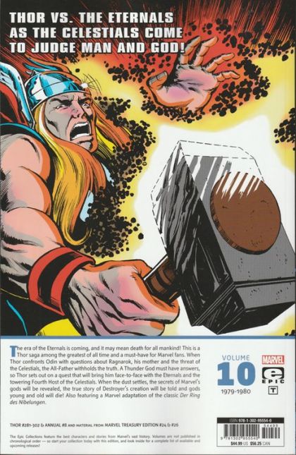 One of the greatest Thor sagas of all time – and a must-have for Marvel fans! The era of the Eternals is coming, and it may mean death for all humankind! When Thor confronts Odin with questions about Ragnarok, his mother and the threat of the Celestials, the All-Father withholds the truth. A Thunder God must have answers, so Thor sets out on a quest that will bring him face-to-face with the Eternals and the towering Fourth Host of the Celestials! When the dust settles, the secrets of Marvel’s gods will be revealed, the true story of Destroyer’s creation will be told and gods young and old will die! Also featuring a Marvel adaptation of the classic Der Ring des Nibelungen! Collecting THOR (1966) #281-302 and ANNUAL (1966) #8 and material from MARVEL TREASURY EDITION #24 and #26. RATED T+