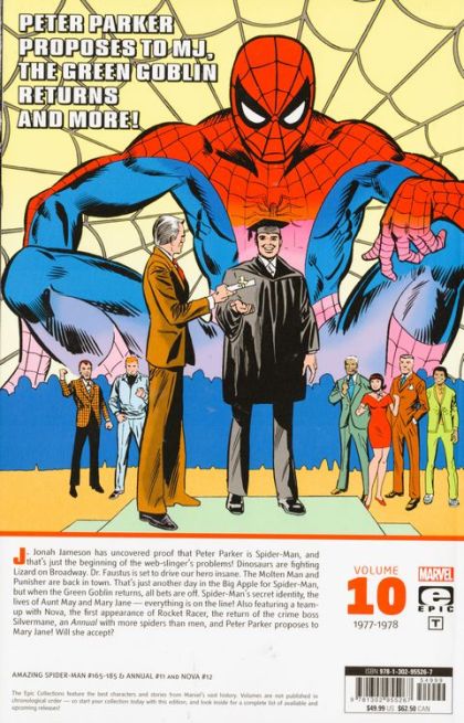 J. Jonah Jameson has uncovered proof that Peter Parker is Spider-Man - and that's just the beginning of the web-slinger's problems! Dinosaurs are fighting the Lizard on Broadway. Doctor Faustus plots to drive our hero insane. And the Molten Man and Punisher are back in town! That's just another day in the Big Apple for Spider-Man! But when the Green Goblin returns, all bets are off! Spider-Man's secret identity, the lives of Aunt May and Mary Jane - everything is on the line! Also featuring a team-up with Nova, the first appearance of Rocket Racer, the return of the crime boss Silvermane, an Annual with more spiders than menand Peter Parker proposes to Mary Jane! Will she accept? Collecting AMAZING SPIDER-MAN (1963) #165-185, AMAZING SPIDER-MAN ANNUAL (1964) #11-12, NOVA (1977) #12 and MARVEL CALENDAR 1978. Rated T