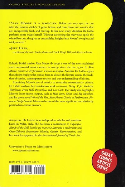 In Alan Moore: Comics as Performance, Fiction as Scalpel, Annalisa Di Liddo argues that Moore employs the comics form to dissect the literary canon, the tradition of comics, contemporary society, and our understanding of history. The book considers Moore's narrative strategies and pinpoints the main thematic threads in his works: the subversion of genre and pulp fiction, the interrogation of superhero tropes, the manipulation of space and time, the uses of magic and mythology, the instability of gender and ethnic identity, and the accumulation of imagery to create satire that comments on politics and art history.