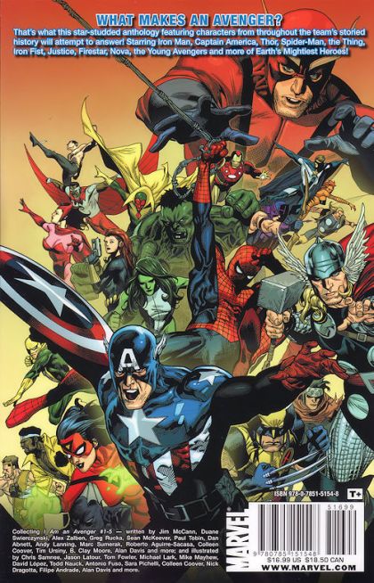 Written by JIM McCANN, DUANE SWIERCZYNSKI, ALEX ZALBEN, GREG RUCKA, SEAN McKEEVER, PAUL TOBIN, DAN ABNETT, ANDY LANNING, MARC SUMERAK, ROBERTO AGUIRRE-SACASA, COLLEEN COOVER, TIM URSINY, B. CLAY MOORE, ALAN DAVIS & MORE Penciled by CHRIS SAMNEE, JASON LATOUR, TOM FOWLER, MICHAEL LARK, MIKE MAYHEW, DAVID L?PEZ, TODD NAUCK, ANTONIO FUSO, SARA PICHELLI, COLLEEN COOVER, NICK DRAGOTTA, FILIPE ANDRADE, ALAN DAVIS & MORE Cover by ALAN DAVIS What makes an Avenger? That's what this star-studded anthology featuring characters from throughout the team's storied history will attempt to answer! Starring Iron Man, Captain America, Thor, Spider-Man, the Thing, Iron Fist, Justice, Firestar, Nova, the Young Avengers and more of Earth's Mightiest Heroes! Collecting I AM AN AVENGER #1-5. 120 PGS./Rated T+
