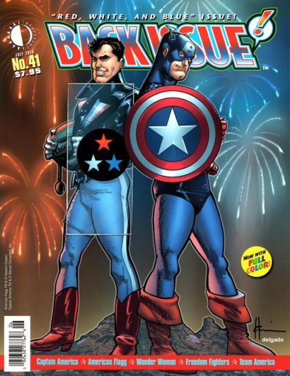 Celebrates Independence Day with the 'Red, White, and Blue' issue, saluting comics' most popular patriots! Captain America gets a star-studded study, with articles examining his Bronze Age highlights as well as the Red Skull's history. Plus, Howard Chaykin's groundbreaking American Flagg, Wonder Woman, the Freedom Fights, and Team America.
