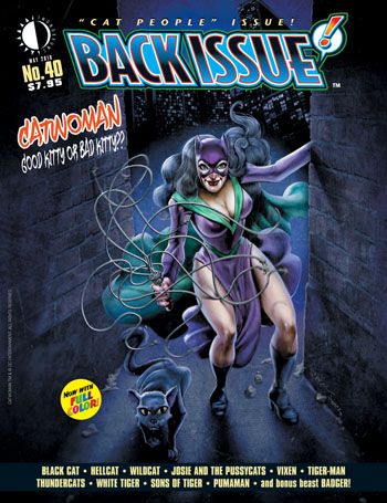 Now shipping 8 times per year, with 16 color pages each issue! “Cat People” claw their way into BACK ISSUE #40, as Catwoman’s Bronze Age good kitty/bad kitty conversion is explored, as are the histories of Spider-Man’s love-hate interest Black Cat, Patsy Walker—Hellcat, Vixen, Atlas Comics’ cat-heroes Tiger-Man and Cougar, Marvel’s kung fu-fightin’ White Tiger and the Sons of the Tiger, and comics’ punchiest pussycat, Wildcat! Plus: Thundercats, Josie and the Pussycats, the little-known movie superhero Pumaman, and a bonus beast, the Badger! With art by and/or commentary from BRIAN BOLLAND, ALAN BRENNERT, ERNIE COLON, GERRY CONWAY, STEVE DITKO, STAN GOLDBERG, PAUL LEVITZ, AL MILGROM, Mystery Science Theater 3000’s MIKE NELSON, KEITH POLLARD, and more. All under a Catwoman cover purrrrfectly produced by JOE STATON and FREDDY LOPEZ, JR.! Edited by MICHAEL EURY.