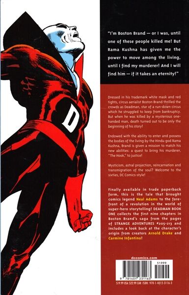 Written by ARNOLD DRAKE, JACK MILLER and NEAL ADAMS Art by CARMINE INFANTINO, NEAL ADAMS and GEORGE ROUSSOS Cover by NEAL ADAMS Master comics artist Neal Adams illustrates the original adventures of deceased, revenge-driven hero Deadman, one of the heroes of BRIGHTEST DAY, from STRANGE ADVENTURES #205-213. These are the stories that introduced costumed high-wire performer Boston Brand, who is assassinated by an unknown marksman in his first adventure, only to return when mysterious deity called Rama Kushna gives him a mission: find his murderer!