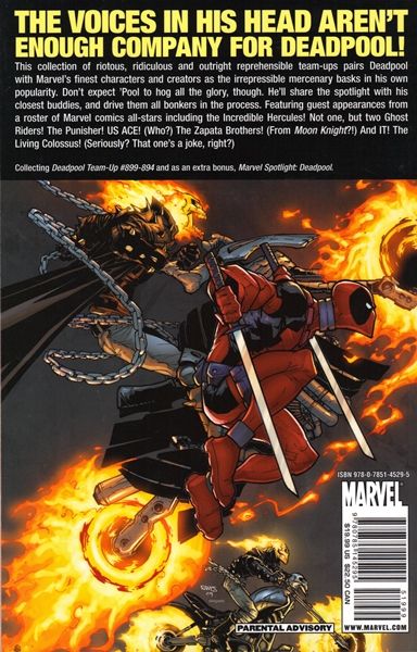 Written by FRED VAN LENTE, MIKE BENSON, ADAM GLASS, STUART MOORE, CHRISTOPHER LONG & IVAN BRANDON Penciled by DALIBOR TALAJIC, CARLO BARBERI, CHRIS STAGGS, SHAWN CRYSTAL, DALIBOR TALAJIC & SANFORD GREENE Cover by HUMBERTO RAMOS Evidently, the voices in his head aren't enough company for Deadpool! This collection of riotous, ridiculous and outright reprehensible team-ups pairs Deadpool with Marvel's finest characters and creators as the irrepressible mercenary basks in his own popularity. Don't expect 'Pool to hog all the glory, though. He'll share the spotlight with his closest buddies, and drive them all bonkers in the process. Featuring guest appearances from a roster of Marvel comics all-stars including the Incredible Hercules! Not one, but two Ghost Riders! The Punisher! US ACE! (Who?) The Zapata Brothers! (From Moon Knight?!) And IT! The Living Colossus! (Seriously? That one's a joke, right?) Collecting DEADPOOL TEAM-UP #899-894 and MARVEL SPOTLIGHT: DEADPOOL. 176 PGS./Parental Advisory