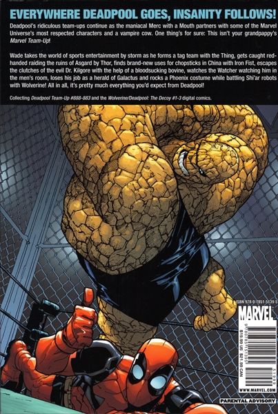 Written by CULLEN BUNN, ROB WILLIAMS, SHANE McCARTHY, RICK SPEARS, TOM PEYER, SKOTTIE YOUNG & STUART MOORE Penciled by TOM FOWLER, MATTEO SCALERA, NICK DRAGOTTA, PHILIP BOND, JACOB CHABOT, RAMON PEREZ & SHAWN CRYSTAL Cover by HUMBERTO RAMOS Everyone's favorite Merc with a Mouth continues hacking and wisecracking his way across the Marvel Universe in this latest volume of riotous, ridiculous and outright reprehensible team-ups! In Round 1, it's clobberin' time as Deapoolmania runs wild on the Thing! In Round 2, Indiana Deadpool runs afoul of Thor amid Asgard's ruins and learns some treasures are best left undisturbed - particularly the ones containing evil, enormously powerful spirits imprisoned by Odin thousands of years hence. In Round 3, Deadpool and Iron Fist grudgingly team up to stop an ancient and villainous warlord - but Deadpool have to take down Iron Fist, as well, to secure his payday? In Round 4, gaze in horror upon the fiendish experiments inflicted upon Deadpool and Bessie the Vampire Cow by the malevolent Dr. Kilgore in the name of mad science, and bear witness to their terrible revenge! In Round 5, the voices in Deadpool's head hire him to do the dirtiest job of his career, but the mission is endangered when he's trapped in an elevator with the Watcher! In Round 6, Deadpool realizes there's no government bailout for super-powered mercenaries and is forced to do the unthinkable: look for a job! Luckily, Galactus has a position open in the Herald department. And for the knockout punch: Wolverine, Deadpool and a giant robot! Collecting DEADPOOL TEAM-UP #888-883 and WOLVERINE/DEADPOOL: THE DECOY (MDCU). 168 PGS./Parental Advisory
