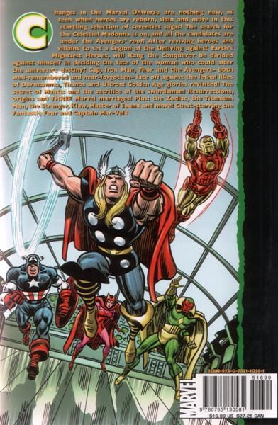 Written by STEVE ENGLEHART, ROY THOMAS, JIM STARLIN & GERRY CONWAY Penciled by BOB BROWN, JOHN BUSCEMA, DON HECK, DAVE COCKRUM, JOE STATON, GEORGE TUSKA, JIM STARLIN & RICH BUCKLER Cover by GIL KANE Changes in the Marvel Universe are nothing new as seen when heroes are reborn, slain and more in this startling selection of seventies sagas! The search for the Celestial Madonna is on, and all the candidates are under the Avengers' roof! After reviving heroes and villains to set a Legion of the Unliving against Earth's Mightiest Heroes, will Kang the Conqueror be divided against himself in deciding the fate of the woman who could alter the universe's destiny? Cap, Iron Man, Thor and Avengers both well-remembered and near-forgotten face off against dthe lethal likes of Dormammu, Thanos and Ultron! Golden Age glories revisited! The secret of Mantis and the sacrifice of the Swordsman! Resurrections, origins and THREE Marvel marriages! Plus: the Zodiac, the Titanium Man, the Stranger, Klaw Master of Sound and more! Guest-starring the Fantastic Four and Captain Mar-Vell! Collecting AVENGERS #120-140, CAPTAIN MARVEL #33, FANTASTIC FOUR #150 and GIANT-SIZE AVENGERS #1-4. 576 PGS./All Ages