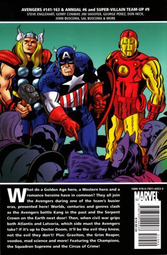 Written by STEVE ENGLEHART, TONY ISABELLA, SCOTT EDELMAN, GERRY CONWAY, JIM SHOOTER, BILL MANTLO & STAN LEE Penciled by GEORGE P?REZ, DON HECK, KEITH POLLARD, JOE SINNOTT, JOHN BUSCEMA, SAL BUSCEMA, PABLO MARCOS, GEORGE TUSKA, SAL TRAPANI & JACK KIRBY Cover by GIL KANE What do a Golden Age hero, a Western hero and a romance heroine have in common? They all join the Avengers during one of the team's busier eras, presented here! Worlds, centuries and genres clash as the Avengers battle Kang in the past and the Serpent Crown on the Earth next door! Then, when civil war grips both Atlantis and Latveria, which side must the Avengers take? If it's up to Doctor Doom, it'll be the evil they know, not the evil they don't! Plus: Graviton, the Grim Reaper, voodoo, mad science and more! Featuring the Champions, the Squadron Supreme and the Circus of Crime! Collecting AVENGERS (1963) #141-163, ANNUAL #6 and SUPER-VILLAIN TEAM-UP #9. 480 PGS./All Ages ?$19.99