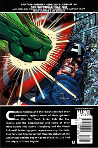 Written by VARIOUS Penciled by VARIOUS Cover by GIL KANE Captain America and the Falcon continue their partnership against some of their greatest foes (the Red Skull, Arnim Zola the Bio-Fanatic and the Corporation) and some of their most bizarre (the Swine, Doughboy and the Vamp/Animus)! Featuring guest appearances by the Hulk, Nick Fury and Sharon Carter! Plus: the debuts of the Constrictor and the Super-Agents of S.H.I.E.L.D.! And the origin of Steve Rogers! Collecting CAPTAIN AMERICA #206-230 and ANNUAL #4, and INCREDIBLE HULK #232. 512 PGS./Rated A