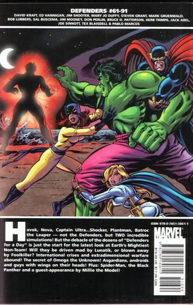 Written by DAVID KRAFT, ED HANNIGAN, JIM SHOOTER, MARY JO DUFFY, STEVEN GRANT & MARK GRUENWALD Penciled by ED HANNIGAN, BOB LUBBERS, SAL BUSCEMA, JIM MOONEY, DON PERLIN, BRUCE D. PATTERSON, HERB TRIMPE, JACK ABEL, JOE SINNOTT, TEX BLAISDELL & PABLO MARCOS Cover by HERB TRIMPE Havok, Nova, Captain Ultra...Shocker, Plantman, Batroc the Leaper - not the Defenders, but TWO incredible simulations! But the debacle of the dozens of 'Defenders for a Day' is just the start for the latest look at Earth's Mightiest Non-Team! Will they be driven mad by Lunatik, or blown away by Foolkiller? International crises and extradimensional warfare abound! The secret of Omega the Unknown! Asgardians, androids and guys with wings on their heads! Plus: Spider-Man, the Black Panther and a guest-appearance by Millie the Model! Collecting DEFENDERS #61-91. 584 PGS./All Ages ?$16.99 ISBN: 978-0-7851-3061-1