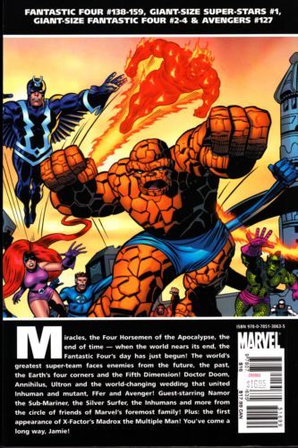 Written by GERRY CONWAY, TONY ISABELLA, LEN WEIN, STAN LEE, ROY THOMAS, MARV WOLFMAN, CHRIS CLAREMONT & STEVE ENGLEHART Penciled by JOHN BUSCEMA, JOE SINNOTT, RICH BUCKLER, ROSS ANDRU, BOB BROWN, DICK AYERS & JOE STATON Cover by GIL KANE Miracles, the Four Horsemen of the Apocalypse, the end of time - when the world nears its end, the Fantastic Four's day has just begun! The world's greatest super-team faces enemies from the future, the past, the Earth's four corners and the Fifth Dimension! Doctor Doom, Annihilus, Ultron and the world-changing wedding that united Inhuman and mutant, FFer and Avenger! Guest-starring Namor the Sub-Mariner, the Silver Surfer, the Inhumans and more from the circle of friends of Marvel's foremost family! Plus: the first appearance of X-Factor's Madrox the Multiple Man! You've come a long way, Jamie! Collecting FANTASTIC FOUR #138-159, GIANT-SIZE SUPER-STARS #1, GIANT-SIZE FANTASTIC FOUR #2-4 and AVENGERS #127. 560 PGS./All Ages ?$16.99 PRODUCT UPDATE (0625008): The Essential Fantastic Four Volume 7 will run 568 pages, not the originally solicited 560 pages.