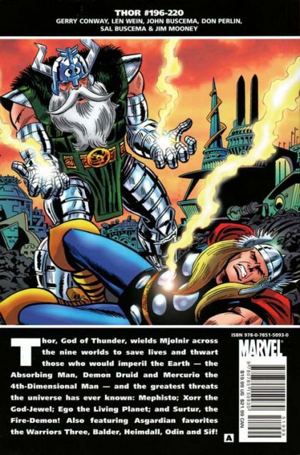 Written by GERRY CONWAY & LEN WEIN Penciled by JOHN BUSCEMA, DON PERLIN & JIM MOONEY Cover by JOHN BUSCEMA Thor, God of Thunder, wields Mjolnir across the nine worlds to save lives and thwart those who would imperil the Earth - the Absorbing Man, Demon Druid and Mercurio the 4th-Dimensional Man - and the greatest threats the universe has ever known: Mephisto; Xorr the God-Jewel; Ego the Living Planet; and Surtur, the Fire-Demon! Also featuring Asgardian favorites the Warriors Three, Balder, Heimdall, Odin and Sif! Collecting THOR #196-220. 528 PGS./Rated A