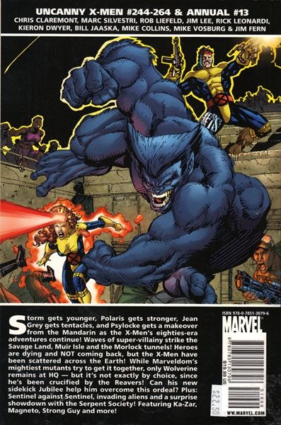 Written by CHRIS CLAREMONT, TERRY AUSTIN & SALLY PASHKOW Penciled by MARC SILVESTRI, ROB LIEFELD, JIM LEE, RICK LEONARDI, KIERON DWYER, BILL JAASKA, MIKE COLLINS, MIKE VOSBURG & JIM FERN Cover by MARC SILVESTRI Storm gets younger, Polaris gets stronger, Jean Grey gets tentacles, and Psylocke gets a makeover from the Mandarin as the X-Men's eighties-era adventures continue! Waves of super-villainy strike the Savage Land, Muir Isle and the Morlock Tunnels! Heroes are dying and NOT coming back, but the X-Men have been scattered across the Earth! While Marveldom's mightiest mutants try to get it together, only Wolverine remains at HQ - but it's not exactly by choice, since he's been crucified by the Reavers! Can his new sidekick Jubilee help him overcome this ordeal? Plus: Sentinel against Sentinel, invading aliens and a surprise showdown with the Serpent Society! Featuring Ka-Zar, Magneto, Strong Guy and more! Collecting UNCANNY X-MEN #244-264 and ANNUAL #13. 544 PGS./All Ages ?$19.99
