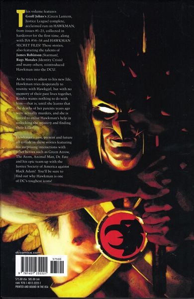 Written by GEOFF JOHNS and JAMES ROBINSON Art by PATRICK GLEASON, RAGS MORALES, SCOT EATON, DON KRAMER, ETHAN VAN SCIVER, JOSE LUIS GARCIA-LOPEZ and others Cover by ANDREW ROBINSON Geoff Johns's complete, acclaimed run on HAWKMAN, from issues #1-25, are collected in hardcover for the first time, along with JSA #56-58 and HAWKMAN SECRET FILES! These stories, also featuring the talents of James Robinson, Rags Morales, Patrick Gleason and many others, reintroduced Hawkman into the DCU as he tries to reunite with Hawkgirl. But with no memory of their past lives together, Kendra wants nothing to do with Hawkman - that is, until she learns that the deaths of her parents years ago were actually murders, and she is forced to enlist Hawkman's help in unlocking the mystery and finding their killer!