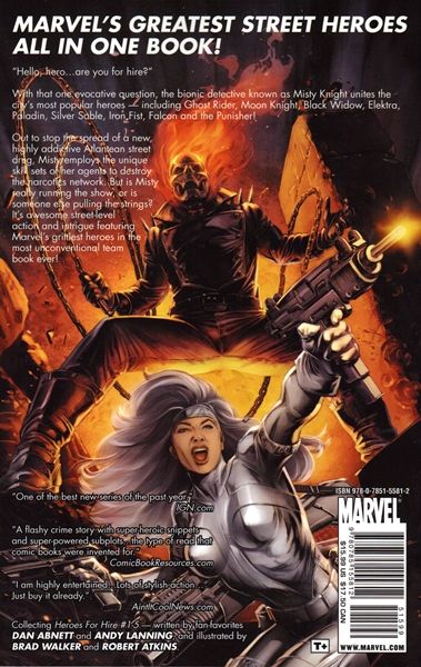 Written by DAN ABNETT & ANDY LANNING Penciled by BRAD WALKER & ROBERT ATKINS Cover by DOUG BRAITHWAITE In the aftermath of SHADOWLAND, Marvel's greatest street heroes - Punisher, Moon Knight, Shroud, Elektra, Paladin, Silver Sable, Ghost Rider, Iron Fist, Falcon, Misty Knight and more - leap into one all-new adventure! Who has brought together these dangerous loners into one fighting force? How is this network different from all other teams? Who is their first target, and what mysteries await them? Discover the answers and enter the action on Marvel's mean streets - courtesy of fan-favorite writers Dan Abnett and Andy Lanning (THE THANOS IMPERATIVE, PUNISHER: YEAR ONE), and artist Brad Walker (GUARDIANS OF THE GALAXY)! Collecting HEROES FOR HIRE (2011) #1-5 and material from X-MEN: CURSE OF THE MUTANTS SPOTLIGHT. 128 PGS./Rated T+