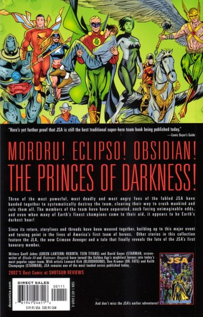 Written by Geoff Johns & David S. Goyer; Art by Leonard Kirk, Don Kramer, Sal Velluto and various; Cover by Carlos Pacheco and Jesus Merino A new collection featuring JSA #46-55! Three of the JSA's deadliest foes band together to systematically destroy the team, clearing their way to crush mankind and rule the world! Can the JSA come together in what appears to be Earth's darkest hour? Collects JSA issues #46-55.