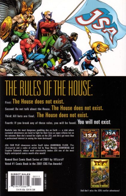 Written by Geoff John; Art by Rags Morales and Stephen Sadowski Just like crime, gambling doesn't pay... especially when you're gambling at The House! This volume collects JSA #26-32 plus a 5-page story from JSA: SECRET FILES #2 by Johns and Derek Aucoin, with a new cover by Michael Bair (HAWKMAN). Roulette runs the most dangerous gambling den on Earth - a club where costumed adventurers are lured to fight for their lives while super-villains bet on the outcome. Now she's turned her sights on the JSA, and she's got more than a professional interest in seeing the team destroyed! Will the JSA's survival come down to a roll of the dice?