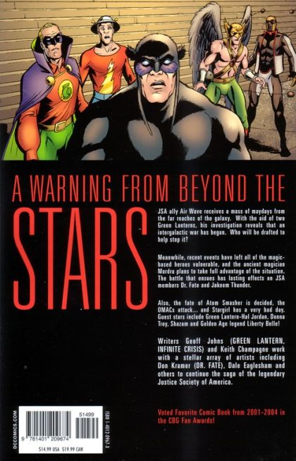 JSA ally Air Wave receives a mass of maydays from the far reaches of the galaxy. With the aid of two Green Lanterns, his investigation reveals that an intergalactic war has begun. Who will be drafted to help stop it? Meanwhile, recent events have left all of the magic-based heroes vulnerable, and the ancient magician Mordru plans to take full advantage of the situation. The battle that ensues has lasting effects on JSA members Dr. Fate and Jakeem Thunder. Also, the fate of Atom Smasher is decided, the OMACs attack... and Stargirl has a very bad day. Guest stars include Green Lantern-Hal Jordan, Donna Troy, Shazam and Golden Age legend Liberty Belle. Collecting: JSA 76-81