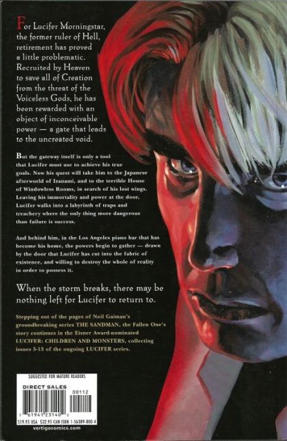 Written by Mike Carey; Art by Peter Gross and Ryan Kelly Picking up where LUCIFER: DEVIL IN THE GATEWAY ends, this trade paperback has Lucifer continuing his plans for a new revolution as he attempts to reclaim his wings from a hell not his own. And as this mission ends, Heaven, Hell and Earth all quickly feel the repercussions. Suddenly old enemies and allies such as the cabaret star Jill Presto, the hybrid angel Elaine Belloc, and the living Tarot deck known as the Basanos cross paths with Lucifer as he draws closer to the apocalyptic showdown that he desires and its resultant new chapter in the history of creation.