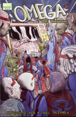 Written by JONATHAN LETHEM & KARL RUSNAK Pencils & Cover by FAREL DALRYMPLE & PAUL HORNSCHEMEIER Nothing -- not The Mink, not The Nowhere Man, not hordes of zombified robots or robotified zombies, not even poisoned hamburgers -- can possibly stop Omega The Unknown from concluding his story in this tenth issue of this precedent-smashing miniseries. Learn the final fates of Alex, Amanda, Fenton and their friends -- as well as the answer to this question: if one of Manhattan's costumed defenders perishes, can anyone take his place? 32 PGS./Rated T+ ?$2.99