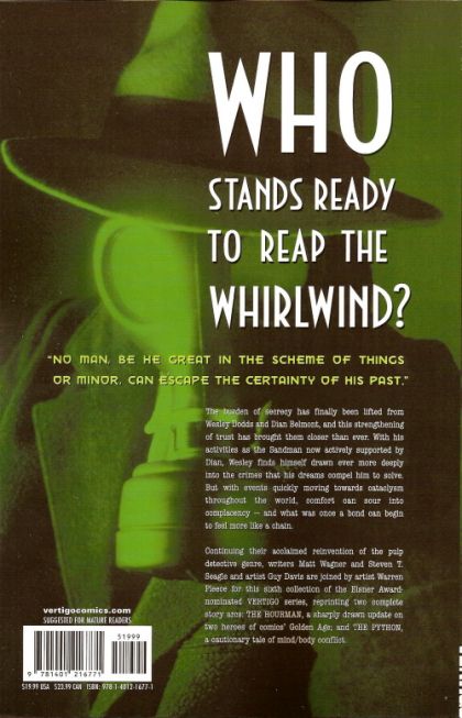 Written by Matt Wagner Cover by Gavin Wilson & Richard Bruning Art by Guy Davis & Warren Pleece This volume follows Wesley Dodds on two chilling new cases. In 'The Hourman,' the Sandman meets an unusual private detective who leaves felons hospitalized. 'The Python' features The Sandman's hunt for a mysterious strangler. Advance-solicited; on sale March 19