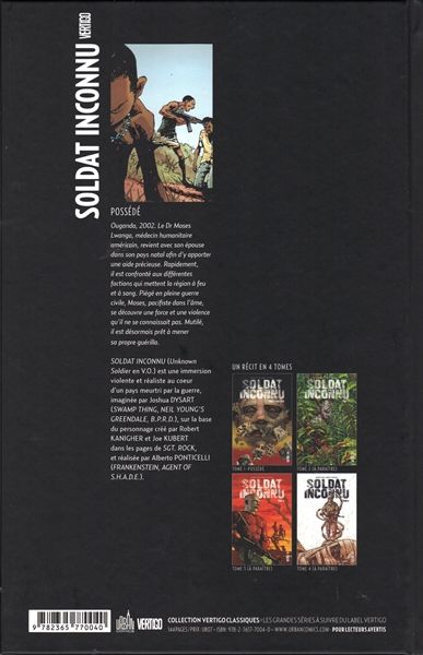 Ouganda, 2002. Le Dr Moses Lwanga, médecin humanitaire américain, revient avec son épouse dans son pays natal afin d’y apporter une aide précieuse. Rapidement, il est confronté aux différentes factions qui mettent la région à feu et à sang. Piégé en pleine guerre civile, Moses, pacifiste dans l’âme, se découvre une force et une violence qu’il ne se connaissait pas. Mutilé, il est désormais prêt à mener sa propre guérilla. (The Unknown Soldier #1-6)