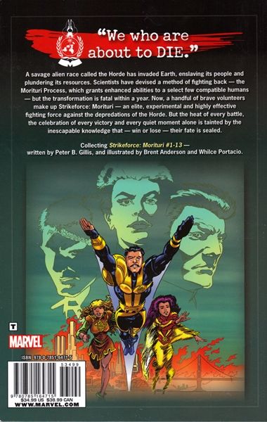 A SAVAGE ALIEN RACE CALLED THE HORDE HAS INVADED EARTH, ENSLAVING ITS PEOPLE AND PLUNDERING ITS RESOURCES.?SCIENTISTS HAVE DEVISED A METHOD OF FIGHTING BACK - THE MORITURI PROCESS, WHICH GRANTS ENHANCED ABILITIES TO A SELECT FEW COMPATIBLE HUMANS - BUT THE TRANSFORMATION IS FATAL WITHIN A YEAR. NOW, A HANDFUL OF BRAVE VOLUNTEERS MAKE UP STRIKEFORCE: MORITURI - AN ELITE, EXPERIMENTAL AND HIGHLY EFFECTIVE FIGHTING FORCE AGAINST THE DEPREDATIONS OF THE HORDE. BUT THE HEAT OF EVERY BATTLE, THE CELEBRATION OF EVERY VICTORY AND EVERY QUIET MOMENT ALONE IS TAINTED BY THE INESCAPABLE KNOWLEDGE THAT - WIN OR LOSE - THEIR FATE IS SEALED. COLLECTING STRIKEFORCE: MORITURI #1-13.