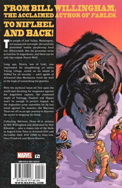 Written by BILL WILLINGHAM, STAN LEE & GARY FRIEDRICH Penciled by NEIL EDWARDS & MARIE SEVERIN Cover by SALVA ESPIN The town of Ash Valley, Washington is massacred overnight, the carefully positioned bodies perplexing local law enforcement. But the gruesome scene is familiar to Asgardians, and there can be only one culprit: the Fenris Wolf. Long ago, Fenris, son of Loki, was imprisoned for slaughtering an entire Viking village, chained away on an island in Niflhel for all eternity - until agents of Advanced Idea Mechanics freed the wolf in the hope of researching his genetics. With the mythical beast set free upon the world and thirsting for vengeance against his Asgardian captors, the combined might of Volstagg, Fandral and Hogun won't be enough to protect Asgard. As the Asgardian army assembles for its last stand against the monster, the Warriors Three set off on an epic journey to discover the secret to stopping the beast. Plus: a classic tale of the Hulk in Asgard! Collecting WARRIORS THREE #1-4, the Hulk story from TALES TO ASTONISH #101 and INCREDIBLE HULK (1968) #102. 128 PGS./Rated T+