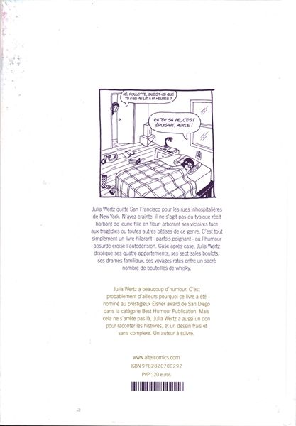 Julia Wertz quitte San Francisco pour les rues inhospitalières de New-York. N'ayez crainte, il ne s'agit pas du typique récit barbant de jeune fille en fleur, arborant ses victoires face aux tragédies ou toutes autres bêtises de ce genre. C'est tout simplement un livre hilarant, parfois poignant, ou l'humour absurde croise l'autodérision. Case après case, Julia Wertz dissèque ses quatre appartements, ses sept sales boulots, ses drames familiaux, ses voyages ratés entre un sacré nombre de bouteilles de whisky.