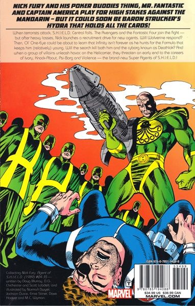 Nick Fury and his poker buddies Thing, Mr. Fantastic and Captain America play for high stakes against the Mandarin - but it could soon be Baron Strucker's Hydra that holds all the cards! When terrorists attack, S.H.I.E.L.D. Central falls. The Avengers and the Fantastic Four join the fight - but after heavy losses, Nick launches a recruitment drive for new agents. Will Wolverine respond? Then, Ol' One-Eye could be about to learn that Infinity isn't forever as he hunts for the Formula that keeps him (relatively) young. Will the search kill both him and the cyborg known as Deathlok? And when a group of villains unleash havoc on the Helicarrier, they threaten an early end to the careers of Ivory, Knock-About, Psi-Borg and Violence - the brand-new Super Agents of S.H.I.E.L.D.! Collecting NICK FURY, AGENT OF S.H.I.E.L.D. (1989) #24-35.