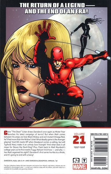 The return of a legend - and the end of an era! Gene 'The Dean' Colan draws Daredevil once again as Mister Fear launches his latest campaign of terror! But when Matt comes between his angry ex-love Black Widow and evil mutant Omega Red, he'll feel more than the Widow's bite! What deadly game is the Avenger playing? And DD meets DP when Deadpool comes a-calling, but will Typhoid Mary make it an unholy love triangle? And what does it all mean for Deuce the Devil-Dog? Plus: Flash back to Matt Murdock's college years as he first meets Foggy Nelson! And how - and why - has Matt regained his sight?! Daredevil's first series hurtles to a finish, and it's going to end with a bang! Collecting DAREDEVIL (1964) #365-380 and #-1, and DAREDEVIL/DEADPOOL ANNUAL '97. Rated T
