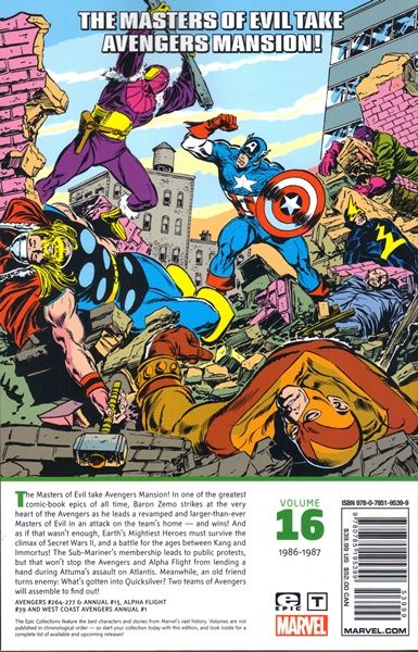 The Masters of Evil take Avengers Mansion! In one of the greatest comic-book epics of all time, Baron Zemo strikes at the very heart of the Avengers as he leads a revamped and larger-than-ever Masters of Evil in an attack on the team's home - and wins! And as if that wasn't enough, Earth's Mightiest Heroes must survive the climax of SECRET WARS II, and a battle for the ages between Kang and Immortus! The Sub-Mariner's membership leads to public protests, but that won't stop the Avengers and Alpha Flight from lending a hand during Attuma's assault on Atlantis. Meanwhile an old friend turns enemy: What's gotten into Quicksilver? Two teams of Avengers will assemble to find out! Collecting AVENGERS (1963) #264-277, ALPHA FLIGHT (1983) #39, AVENGERS ANNUAL #15 and WEST COAST AVENGERS ANNUAL #1. Rated T