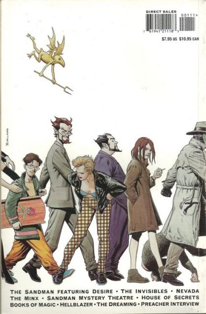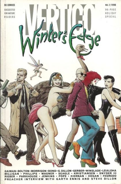 A holiday special featuring an all-new story of Desire of the Endless written by Neil Gaiman, with art by John Bolton. House of Secrets' Rain hosts this first-ever Vertigo holiday anthology, featuring winter tales of some of the line's most popular characters, as well as previews of new upcoming titles: the adventures of The Minx, a new monthly where sex, politics, religion and monkey gods abound by Vertigo mainstays Peter Milligan and Sean Phillips; and Nevada, a spicy, cosmic mystery about a Vegas showgirl, a scene-stealing ostrich and a highly creative vivisectionist, by legendary writer Steve Gerber and artists Phil Winslade and Steve Leialoha. Other stories range from seasonal satire to holiday horror, starring Hellblazer's John Constantine, written by Paul Jenkins with art by THB's Paul Pope; The Books of Magic's Tim Hunter by John Ney Rieber and artist Steve Parkhouse, The Invisibles by Grant Morrison, with art by Philip Bond and Glyn Dillon, The Dreaming's Cain and Abel, written by Peter Hogan and Caitlin R. Kiernan with art by Girl's Duncan Fegredo; and Sandman Mystery Theatre's Golden Age Sandman, written by Matt Wagner and Steven T. Seagle, with art by John K. Snyder, and a House of Secrets story (and framing device for the special) by creators Steven T. Seagle and Teddy Kristiansen. Plus, a Preacher interview with Garth Ennis and Steve Dillon. Painted wraparound cover by Brian Bolland. Mature Readers. FC, 96 pg. Rebax Format. Cover price $7.95.