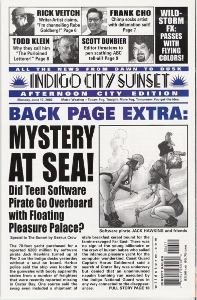 WRITTEN BY RICK VEITCH; ART BY VEITCH AND FRANK CHO; COVER BY VEITCH In stores June 5. This issue: Greyshirt escapes a moldy grave! When captured by Black Jack Hawkins ? Scourge of Crater Bay ? Greyshirt must flee for his life before the denizens of Old Moldy get him. Will the buccaneers be as lucky? Stay tuned for the final revelation in the Franky and Johnny saga...and the role the Lure has played in Indigo history. You won't want to miss the wrap-up in the Sunset, featuring guest-art by Frank Cho (Liberty Meadows)! No Ads. FC, 32 PG. (6 OF 6) $3.50 Cover price $3.50.