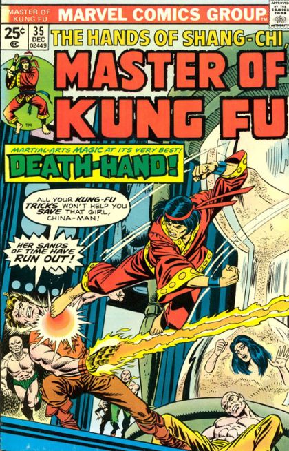 "Death-Hand and the Sun of Mordillo!" Part 3 of 3. Script by Doug Moench, pencils by Paul Gulacy, inks by Dan Adkins. Shang Chi must defeat a mad man or the woman, Leiko Wu, shall perish in a death trap of the villain's own design. NOTE: The peculiar denizens of the strange island in this story return again to harass Rom the Spaceknight in Rom # 47. The Hulk stars in a one-page Hostess ad, "The Twins of Evil!" Gil Kane cover pencils. Cover price $0.25.