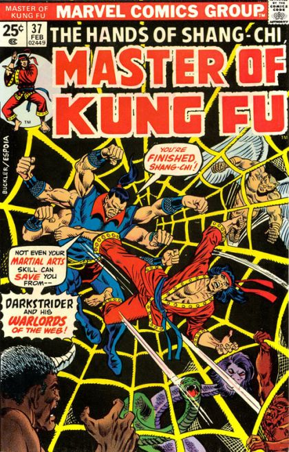"Web of Dark Death!" Part 2 of 2. Script by Doug Moench, pencils by Keith Pollard, inks by Sal Trapani. On one side is the benevolent ancient one called Moon Sun and his menagerie of mythic beasts. On the other side is army of immortal ninja, a force for darkness. And, stuck in the middle of these warring factions is Shang Chi, the Master of Kung Fu. Spider-Man stars in a one-page Hostess ad, "The Kidnap Caper." Rich Buckler cover pencils (Mike Esposito and Frank Giacoia cover inks?). Cover price $0.25.