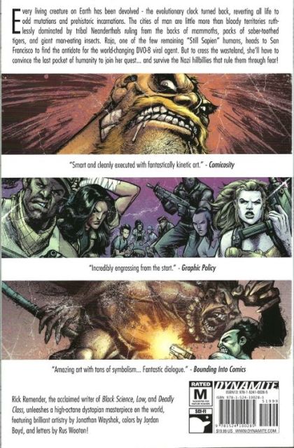 Every living creature on Earth has been devolved - the evolutionary clock turned back, reverting all life to odd mutations and prehistoric incarnations. The cities of man are little more than bloody territories ruthlessly dominated by tribal Neanderthals ruling from the backs of mammoths, packs of saber-toothed tigers, and giant man-eating insects. Raja, one of the few remaining "Still Sapien" humans, heads to San Francisco to find the antidote for the world-changing DVO-8 viral agent. But to cross the wasteland, she'll have to convince the last pocket of humanity to join her quest... and survive the Nazi hillbillies that rule them through fear! Rick Remender, the acclaimed writer of Black Science, Low, and Deadly Class, unleashes a high-octane dystopian masterpiece on the world, featuring the brilliant artistry of Jonathan Wayshak!