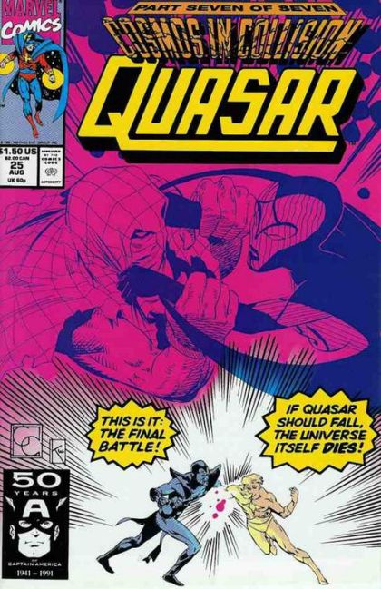 Quasar realizes his previous attempt would not be enough and throws himself into the maw of the black hole and attempts to release all the power at his disposal which could start a reaction that might reverse the flow of the black hole. However, he is shunted to Oblivionâs realm, he is greeted by Oblivion and his new Avatar, Maelstrom. Maelstrom is quickly augmented by Oblivion, and Maelstrom declares that they will thrash the Infinity-force out of him. It is then that Infinity makes her presence known she augments Quasar so that he and Maelstrom are on even terms; Oblivion tells her that it is time that a new deal is struck between the forces of life and death. Infinity regretfully agrees. The battle is met and they find that they are indeed too evenly matched, which means that there is no one to stop the black hole. Finally after several minutes Quasar realizes that his retroactively changed costume makes him more of an anomaly than Maelstrom, this minor fact throws off Maelstromâs concentration and he is destroyed by the Quantum-bands, causing a chain reaction which causes the black hole to reverse itself. Eternity and Death arrive on the scene to strike a new deal with their siblings. Quasar realizing that Eternity, Infinity, Death, and Oblivion make up the cosmological compass of the universe. Quasar, unable to glean a single word of the conversation, returns to Earth. He restores the Earthâs rotation, freeing all of Earthâs mystics who were holding off the detrimental effects. Quasar returns to his body and merges his energy avatar with it, placing the Quantum-bands at the end of the severed arms. He resurrects himself and restores his hands. Creating a new costume. Infinity appears before him and explains that a new deal has been made; Quasar returns the power she lent to her. She says that the universe is in his debt.