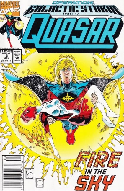 A Skrull ship tows the Nega-Bomb through the stargate above Earth's sun. Quasar and Her fight the Super-Skrull in an attempt to stop it, but when Quasar notices the sun bubbling up with sunspots with the same energy signature as the bomb, he elects to let the Skrulls pass through the other stargate to get it out of the vicinity. He's about to go after them, but the reaction in the sun isn't stopping. With Epoch's help, they identify the cause of the sun's ailment as an infection of anti-matter. With few available options, Quasar asks Epoch and Her to go looking for more help while he risks himself by diving into the sun and shunting as much anti-matter as he can into the Quantum Zone. He isn't fast enough though, and he's soon joined in the sun by Binary, who came through the gate in pursuit of the Nega-Bomb but couldn't continue with her mission when she learned her solar system was in danger.