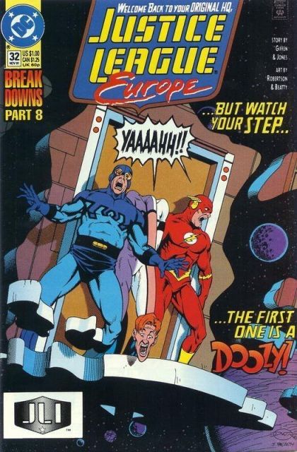Breakdowns Part 8, continued from Justice League America (1987) #56. The Justice League find themselves back in the original JLA mountain headquarters. Blue Beetle, Flash and Ralph decide to visit the Doom Patrol, and run into the wacky situations the Patrol usually encounters. Continued in Justice League America (1987) #57. Written by Keith Giffen and Gerard Jones, with art and cover by Darick Robertson and John Beatty. Cover price $1.00.