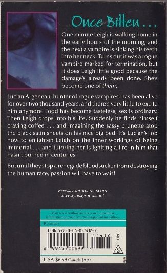 Once Bitten . . . One minute Leigh is walking home in the early hours of the morning, and the next a vampire is sinking his teeth into her neck. Turns out it was a rogue vampire marked for termination, but it does Leigh little good because the damage's already been done. She's become one of them. Lucian Argeneau, hunter of rogue vampires, has been alive for over two thousand years, and there's very little to excite him anymore. Food has become tasteless, sex is ordinary. Then Leigh drops into his life. Suddenly he finds himself craving coffee . . . and imagining the sassy brunette atop the black satin sheets on his nice big bed. It's Lucian's job now to enlighten Leigh on the inner workings of being immortal . . . and tutoring her is igniting a fire in him that hasn't burned in centuries. But until they stop a renegade bloodsucker from destroying the human race, passion will have to wait!