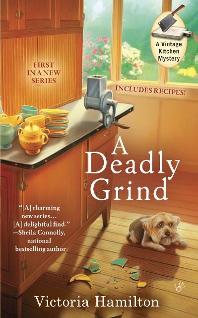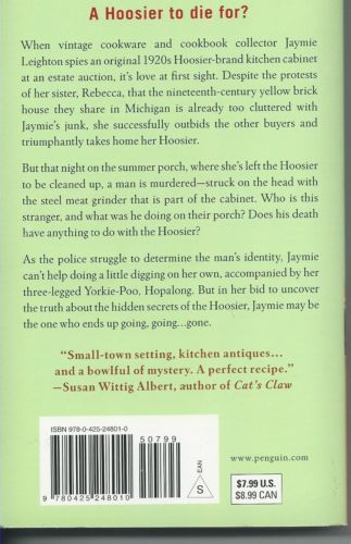 A Hoosier to die for?When vintage cookware and cookbook collector Jaymie Leighton spies an original 1920s Hoosier brand kitchen cabinet at an estate auction, it’s love at first sight. Despite the protests of her sister that the 19th-century yellow-brick house they share in Michigan is already too cluttered with Jaymie’s “junk,” she successfully outbids the other buyers and triumphantly takes home her Hoosier.But that night on the summer porch where they’ve left the Hoosier to be cleaned up, a man is murdered, struck on the head with the steel meat grinder that is part of the cabinet. Who is this stranger—and what was he doing on their porch? Does his death have anything to do with the Hoosier?As the police struggle to determine the man’s identity, Jaymie can’t help doing a little digging on her own, accompanied by her three-legged Yorkie Poo, Hopalong. But in her bid to uncover the truth about the hidden secrets of the Hoosier, Jaymie may be the one who ends up going, going…gone.