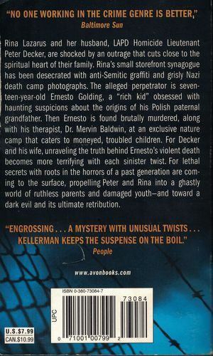 Rina Lazarus and her husband, LAPD Homicide Lieutenant Peter Decker, are shocked by an outrage that cuts close to the spiritual heart of their family. Rina's small storefront synagogue has been desecrated with anti-Semitic graffiti and grisly Nazi death camp photographs. The alleged perpetrator is seventeen-year-old Ernesto Golding, a "rich kid" obsessed with haunting suspicions about the origins of his Polish paternal grandfather. Then Ernesto is found brutally murdered, along with his therapist, Dr. Mervin Baldwin, at an exclusive nature camp that caters moneyed, troubled children. For Decker and his wife, unraveling the truth behind Ernesto's violent death becomes more terrifying with each sinister twist. For lethal secrets with roots in the horrors of a past genteration are coming to the surface, propelling Peter and Rina into a ghastly world of ruthless parents and damaged youth -- and toward a dark evil and its ultimate retribution.