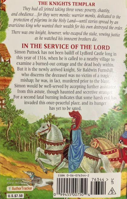 The Knights Templar They had all joined taking three vows: poverty, chastity, and obedience…for they were monks: warrior monks, dedicated to theprotection of pilgrims in the Holy Land -- until stories spread by anavaricious king who wanted their wealth for his own destroyed the order. There was one knight, however, who escaped the stake, vowing justiceas he watched his innocent brothers die. In the Service of the Lord Simon Puttock has not been bailiff of Lydford Castle long in this year of 1316, when he is called to a nearby village to examine a burned-out cottage and the dead body within. But it is the newly arrived knight, Sir Baldwin Furnshill, who discerns the deceased was no victim of a tragic mishap; he was, in fact, murdered prior to the blaze. Simon would be well-served by accepting further assistance from this astute, though haunted and secretive stranger. For a second fatal burning indicates that some harsh evil has invaded this once-peaceful place, and its hunger has yet to be sated.