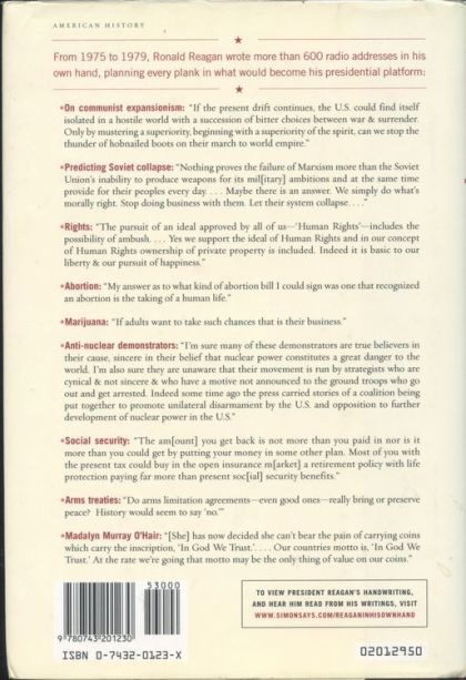 Until Alzheimer's disease wreaked its gradual destruction, Ronald Reagan was an inveterate writer. He wrote not only letters, short fiction, poetry, and sports stories, but speeches, newspaper articles, and radio commentary on public policy issues, both foreign and domestic. Most of Reagan's original writings are pre-presidential. From 1975 to 1979 he gave more than 1,000 daily radio broadcasts, two-thirds of which he wrote himself. They cover every topic imaginable: from labor policy to the nature of communism, from World War II to the second Strategic Arms Limitation Treaty, from the future of Africa and East Asia to that of the United States and the world. They range from highly specific arguments to grand philosophy to personal stories. Even those who knew him best were largely unaware of Reagan's output. George Shultz, as he explains in the Foreword, was surprised when he first saw the manuscripts, but on reflection he really was not surprised at all. Here is definitive proof that Ronald Reagan was far more than a Great Communicator of other people's ideas. He was very much the author of his own ideas, with a single vision that he pursued relentlessly at home and abroad. Reagan, In His Own Hand presents this vision through Reagan's radio writings as well as other writings selected from throughout his life: short stories written in high school and college, a poem from his high school yearbook, newspaper articles, letters, and speeches both before and during the presidency. It offers many surprises, beginning with the fact that Reagan's writings exist in such size and breadth at all. While he was writing batches and batches of radioaddresses, Reagan was also traveling the country, collaborating on a newspaper column, giving hundreds of speeches, and planning his 1980 campaign. Yet the wide reading and deep research self-evident here suggest a mind constantly at work. The selections are reproduced with Reagan's own edits, offering a unique window into his thought processes. These writings show that Reagan had carefully considered nearly every issue he would face as president. When he fired the striking air-traffic controllers, many thought that he was simply seizing an unexpected opportunity to strike a blow at organized labor. In fact, as he wrote in the '70s, he was opposed to public-sector unions using strikes. There has been much debate as to whether he deserves credit for the end of the cold war; here, in a 1980 campaign speech draft, he lays out a detailed vision of the grand strategy that he would pursue in order to encourage the Soviet system to collapse of its own weight, completely consistent with the policies of his presidency. Furthermore, in 1984, Reagan drafted comments he would make to Soviet foreign minister Andrei Gromyko at a critical meeting that would eventually lead to history's greatest reductions in armaments. Ronald Reagan's writings will change his reputation even among some of his closest allies and friends. Here, in his own hand, Reagan the thinker is finally fully revealed.