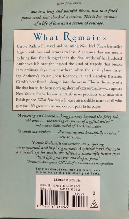 Carole Radziwill's vivid and haunting New York Times bestseller begins with loss and returns to loss. A summer that was meant to bring four friends together in the final weeks of her husband Anthony's life brought instead the kind of tragedy that breaks into ordinary days in a heartbeat, when the small plane carrying Anthony's cousin John Kennedy Jr. and Carolyn Bessette, Carole's best friend, plunged into the ocean. This is the story of a life that has so far been nothing short of extraordinary -- an upstate New York girl who became an ABC news producer who married a Polish prince. What Remains will leave an indelible mark on all who glimpse life's greatest joys and deepest pain in its pages.