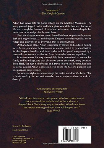 The first novel in Lawrence Watt-Evans' Obsidian Chronicles, Dragon Weather.Can one young boy beat the odds to avenge his family's death by dragon? Arlian had never left his home village on the Smoking Mountain. The stony ground, jagged peaks, and black glass were all he had ever known of life, and though he dreamed of travel and adventure, he knew deep in his heart that he would probably never leave.Until the dragon weather came. Incredible heat, oppressive humidity, dark and angry clouds . . . and dragons. Dragons with no feelings, no sympathy, no use for humans; dragons who destroyed his entire village and everyone in it. Everyone, that is, except Arlian.Orphaned and alone, Arlian is captured by looters and sold as a mining slave. Seven years later Arlian escapes, fueled by years of hatred for the dragons, bandits, and slavers that took his youth away--and a personal vow to exact retribution from those who have wronged him.As Arlian makes his way through life, he is obsessed with the concept of justice, determined to avenge his family and his village, and that obsession informs every task, every decision. Even Black, the man he befriends and grows to love as a brother, has little influence against Arlian's obsession. His entire life has one purpose, and one purpose only: revenge. But can one righteous man change the entire world for the better? Or is he doomed by his own actions to become as unjust as those he seeks to destroy?